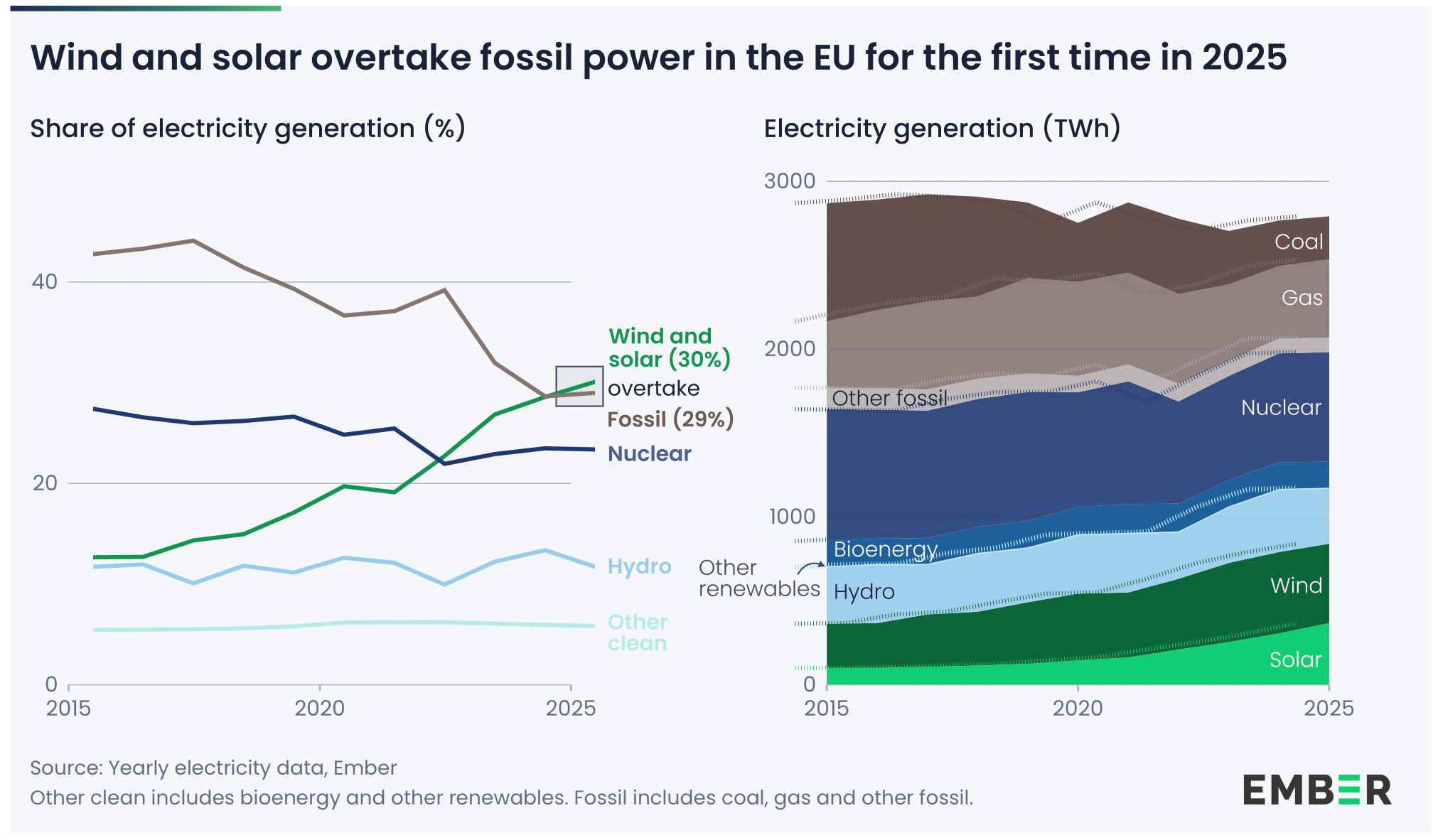 «Nel 2025, l'UE ha compiuto un enorme passo avanti verso un sistema energetico pulito basato sull'eolico e sul solare. Per la prima volta, l'eolico e il solare hanno prodotto più elettricità dei combustibili fossili nell'UE. Le energie rinnovabili nazionali hanno continuato a rappresentare circa la metà dell'energia elettrica dell'UE, grazie alla collaborazione record tra l'eolico e il solare»: lo spiega il think tank Ember nel suo rapporto "European Electricity Review 2026".