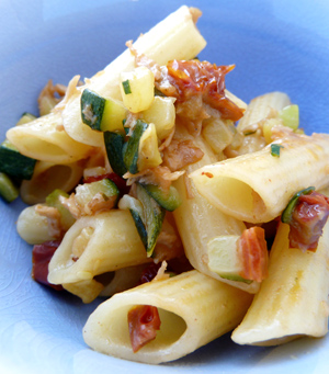 Bollite in poca acqua leggermente salata il macinato di soia e lasciate in infusione in acqua calda i pomodori secchi tagliati finemente. Affettate piuttosto sottilmente la cipolla e doratela in padella per qualche minuto. Unite la zucchina tagliata in cubetti particolarmente piccoli ma regolari. Lasciate andare per un paio di minuti, quindi sfumate con un goccio di vino rosso. Unite il macinato di soia, sgocciolato, mescolate, salate e lasciate andare per un altro paio di minuti, quindi versate i pomodori sgocciolati. Continuate la cottura fino a che le zucchine non saranno tenere. Terminate con una girata di pepe nero ed un paio di steli di erba cipollina fresca tagliati finemente. Aggiungete un cucchiaino di pomodoro concentrato; scolate la pasta e passatela nell’intingolo a fuoco medio per un paio di minuti, assieme a qualche cucchiaio d’acqua di bollitura. Lasciato assorbite, mescolando per bene e servite. Così per la cronaca, abbiamo dato fondo alle penne mais/riso per celiaci che avevamo di scorta per parenti di parenti, celiaci ed allergici ai latticini. Tutto sommato l’esperienza non è stata malvagia, l’unica cosa strana di questa pasta è che sembra cuocersi poco uniformemente; se una penna pareva cotta, quella successiva sembrava mezza cruda. Misteri dell’industria alimentare…