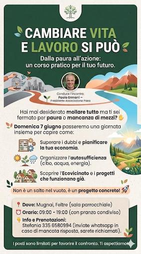 Diomenica 7 giugno Paolo Ermani tiene il corso "Cambiare vita e lavoro si può", presso la sala parrocchiale di Mugnai, Feltre.