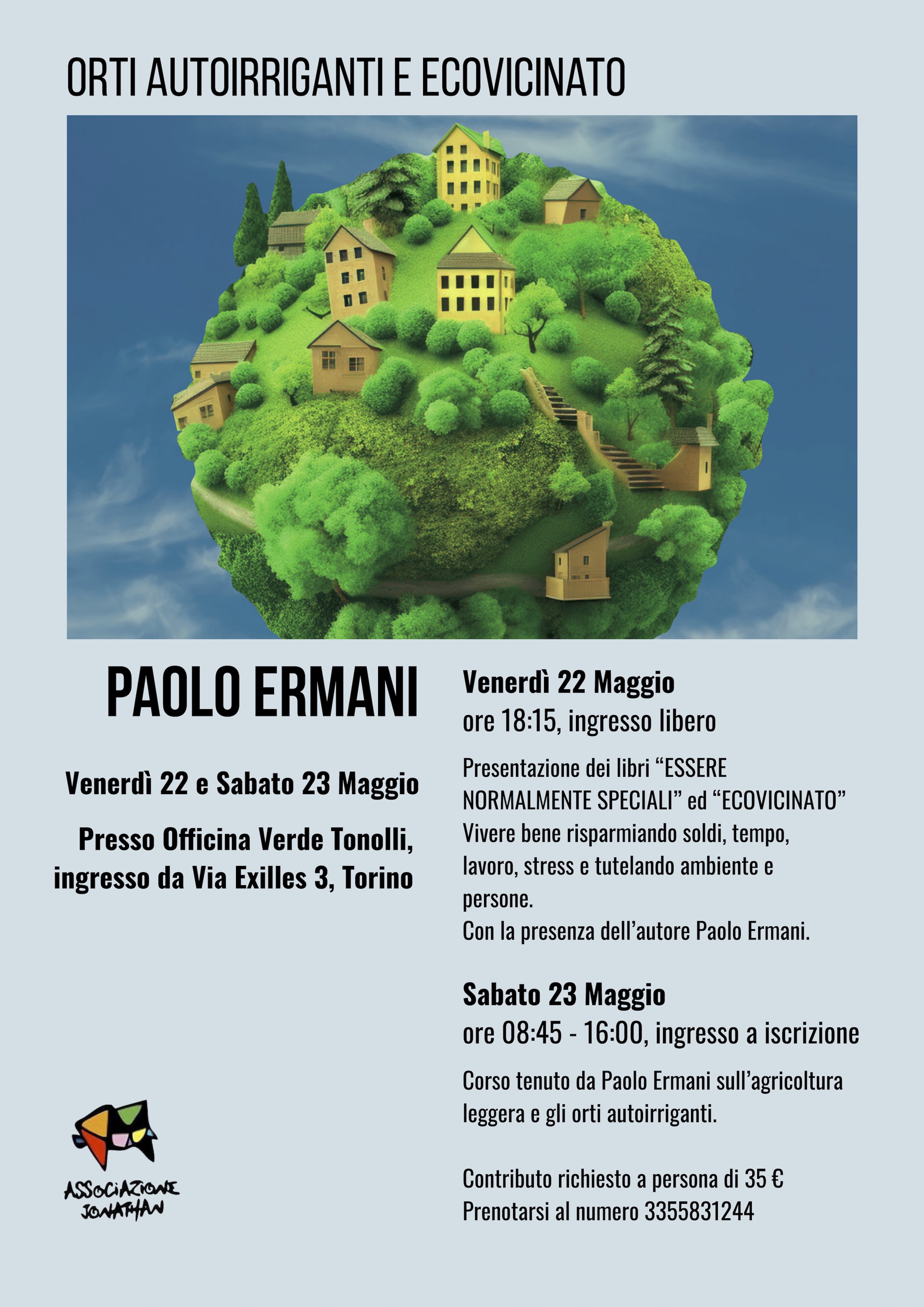 Il 22 maggio all'Officina Verde Tonolli a Torino Paolo Ermani presenta i suoi libri "Essere normalmente speciali" ed "Ecovicinato"; il giorno dopo tiene un corso sull'agricoltura leggere e gli orti autoirriganti